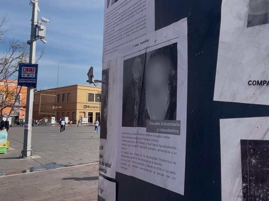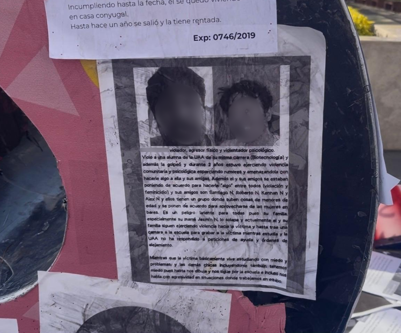 En una de las consignas se señala a un catedrático de la Universidad Autónoma de Aguascalientes de violencia vicaria, y de pensiones alimenticias insuficientes de apenas 300 pesos semanales, se acusa a la máxima casa de estudios de solapar al supuesto victimario al modificar sueldos.