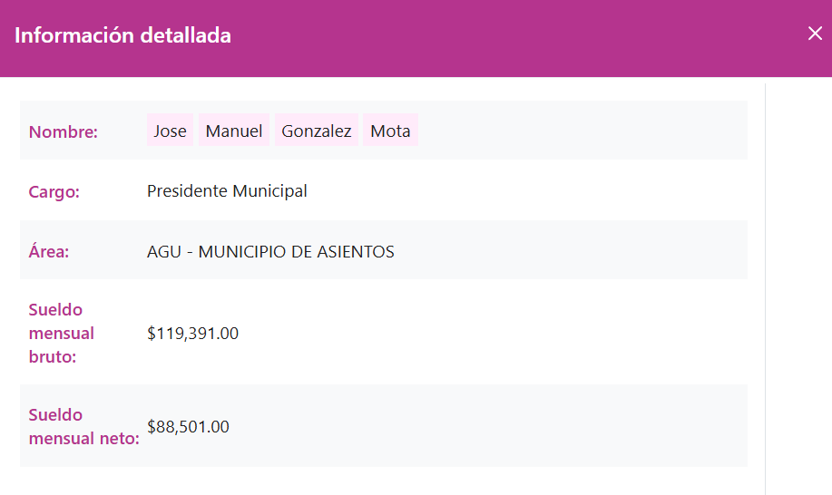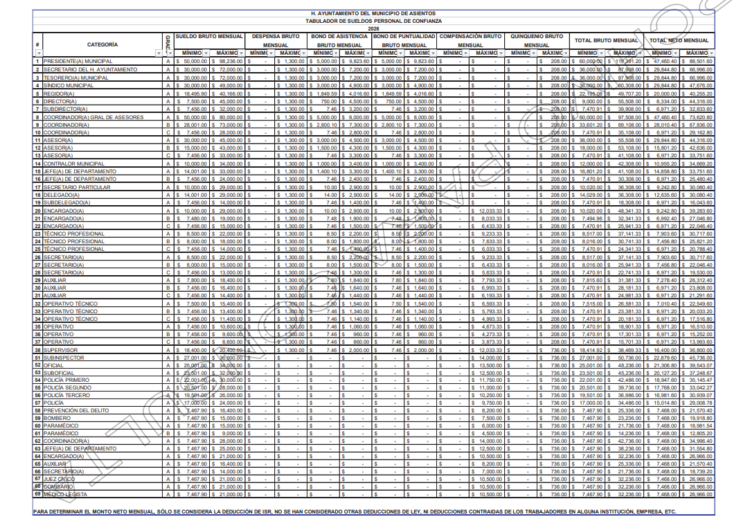 En el Tabulador de Sueldos de Personal de Confianza del Presupuesto de Egresos del Municipio de Asientos para el 2026, se constata que el presidente municipal, José Manuel González Mota, recibe bonos mensuales de despensa, asistencia y puntualidad, que en conjunto podrían alcanzar los 21 mil pesos mensuales adicionales a su sueldo neto mensual de hasta 88 mil 501 pesos.