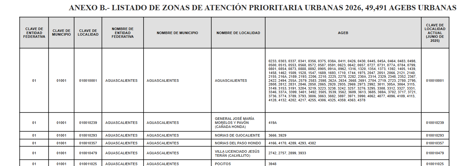 Lo anterior, se desprende de la Declaratoria de las Zonas de Atención Prioritaria para el año 2026, publicada en noviembre del 2025, en el Diario Oficial de la Federación.