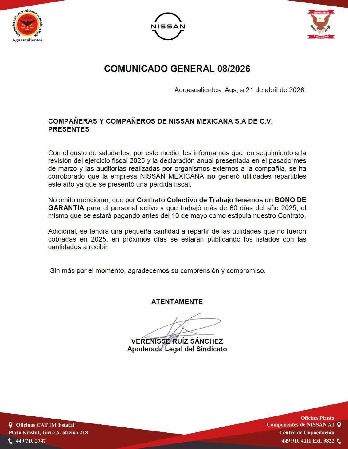 Por lo tanto, la representante de los trabajadores indica que el bono equivalente a 25 días de salario tabulado, será entregado antes del 10 de mayo a cerca de 8 mil empleados en las plantas de Nissan Aguascalientes. El monto será variable, dependiendo del nivel salarial de cada trabajador sindicalizado.