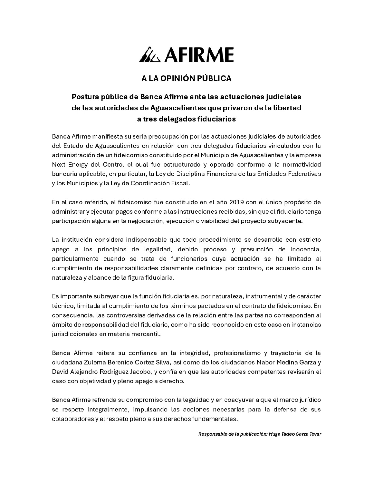 Banca Afirme manifiesta su seria preocupación por las actuaciones judiciales de autoridades del Estado de Aguascalientes en relación con tres delegados fiduciarios vinculados con la administración de un fideicomiso constituido por el Municipio de Aguascalientes y la empresa Next Energy del Centro, el cual fue estructurado y operado conforme a la normatividad bancaria aplicable, en particular, la Ley de Disciplina Financiera de las Entidades Federativas y los Municipios y la Ley de Coordinación Fiscal.