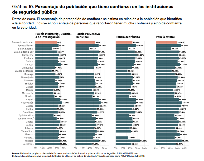 Según el estudio, con base en datos del 2024, la segunda corporación de seguridad pública con menor porcentaje de percepción de confianza en Aguascalientes, es la policía preventiva municipal, con 64%.