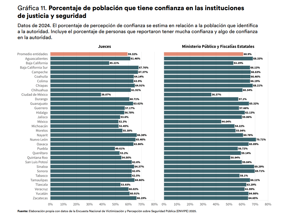 Respecto al porcentaje de la población en Aguascalientes que confía en las instituciones de justicia y seguridad, poco más del 68% de los ciudadanos en la entidad, percibió confianza en el Ministerio Público y la Fiscalía Estatal, frente a 61% que así lo manifestó por los jueces en la entidad.