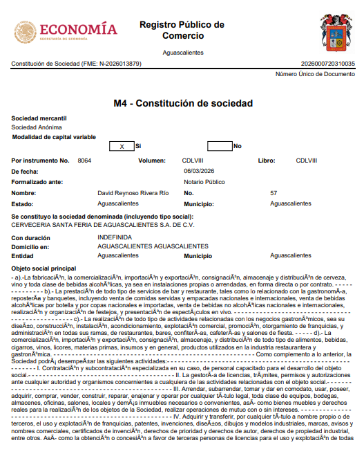 Con un capital social mínimo de 50 mil pesos, la sociedad “Cervecería Santa Feria de Aguascalientes S.A. DE C.V” se constituyó el pasado mes de marzo ante el notario público 57, David Reynoso Rivera Río, con duración indefinida, para su instalación en la Feria Nacional de San Marcos.