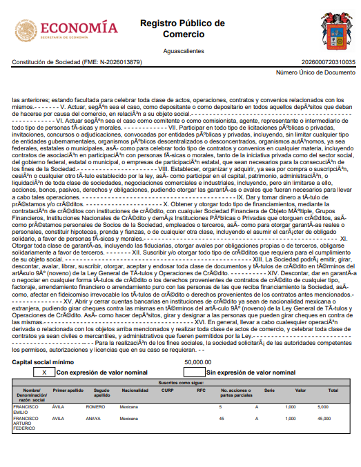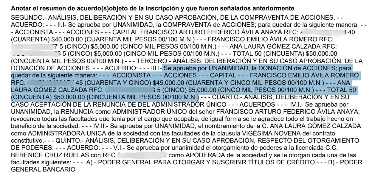 De acuerdo con una revisión realizada por BI Noticias, en el Registro Público de la Propiedad y el Comercio, en un inicio, Francisco Arturo Federico Ávila Anaya, diputado federal de Morena, figuraba como administrador único de la sociedad y como el socio mayoritario del proyecto, con el 90% de las acciones.