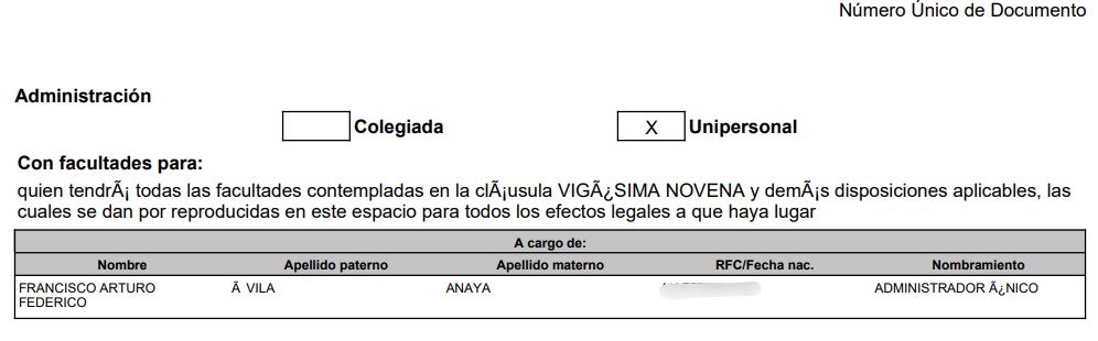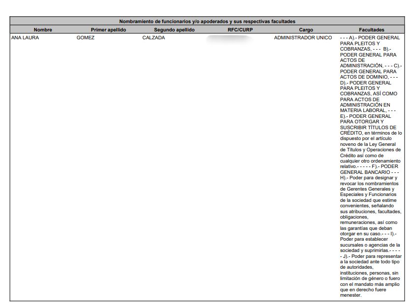 Tras la salida de Ávila Anaya, Gómez Calzada fue designada administradora única de la sociedad, con poder general para pleitos y cobranzas, actos de administración, actos de dominio, administración en materia laboral, otorgar y suscribir títulos de crédito, poder general bancario; para designar y revocar nombramientos de gerentes y funcionarios de la sociedad, para establecer sucursales o agencias de la sociedad y suprimirlas y poder para representar a la sociedad ante todo tipo de autoridades.
