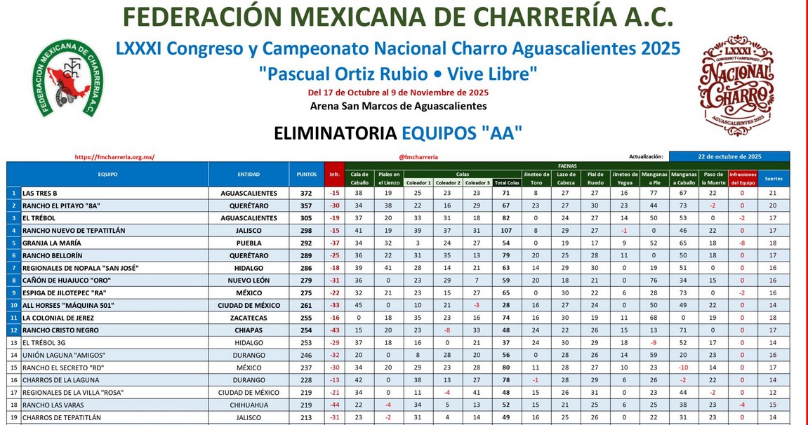 Cinco manganas y un gran oficio le dieron a Rancho El Pitayo “8A” de Querétaro una estupenda victoria la tarde de ayer al son de 357 puntos, colocándose ahora en la segunda posición de la categoría “AA” solo por debajo de Las Tres B en el LXXXI Congreso y Campeonato Nacional Charro Aguascalientes 2025 “Pascual Ortiz Rubio – Vive Libre”.