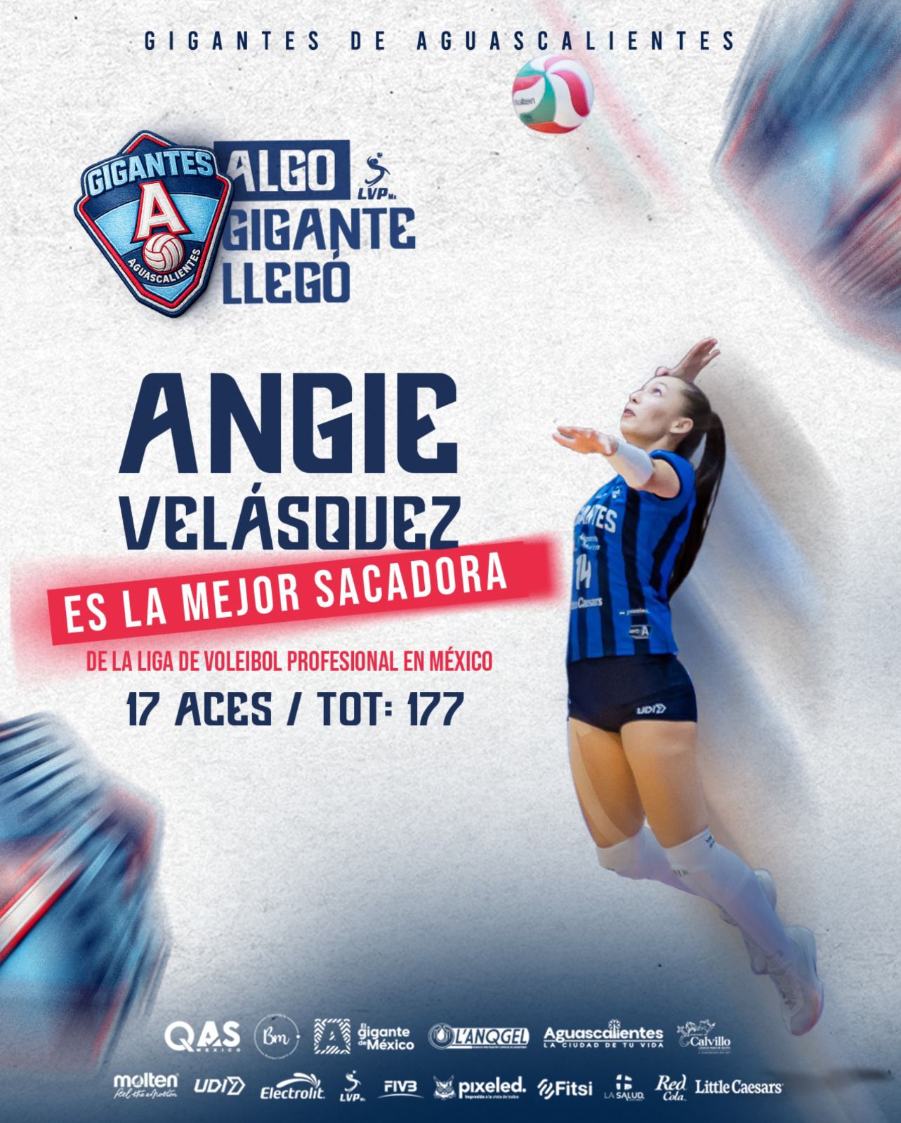 La armadora colombiana Angie Velasquez tomó la cima de las mejores jugadoras al servicio en la Liga de Voleibol Profesional (LVP) MX, luego de la contundente victoria de Gigantes de Aguascalientes sobre Leonas de León.
