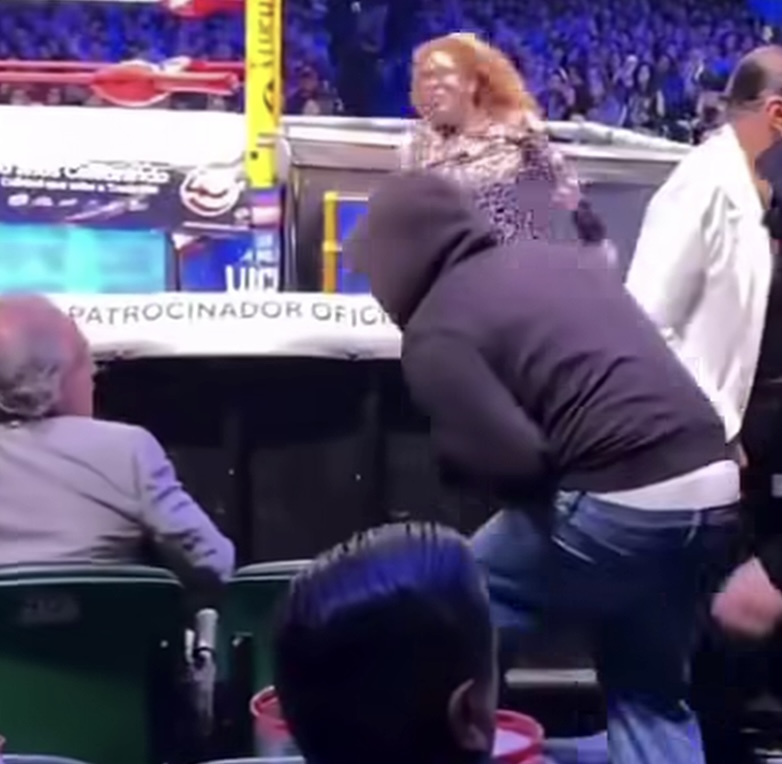 El intérprete de "Ojitos lindos" portaba una máscara del luchador Místico, además de cubrir su cabeza con una sudadera. Los videos lo captaron tomar asientos de primera fila junto con su equipo.