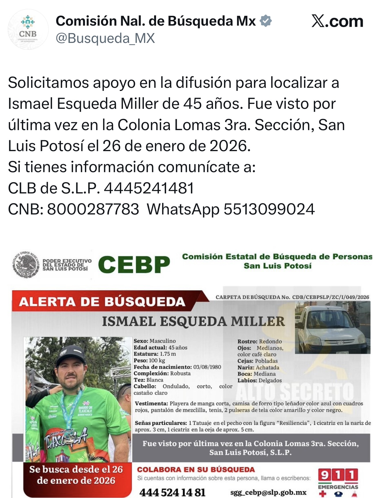 La Comisión Estatal de Búsqueda de Personas de San Luis Potosí emitió una ficha para localizar a Ismael Esqueda Miller, nieto de Lucha Villa, quien fue reportado como desaparecido el pasado 26 de enero de 2026.