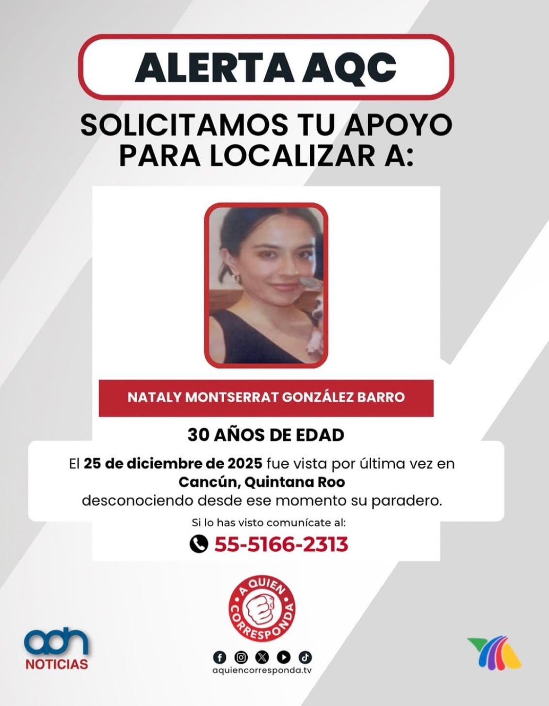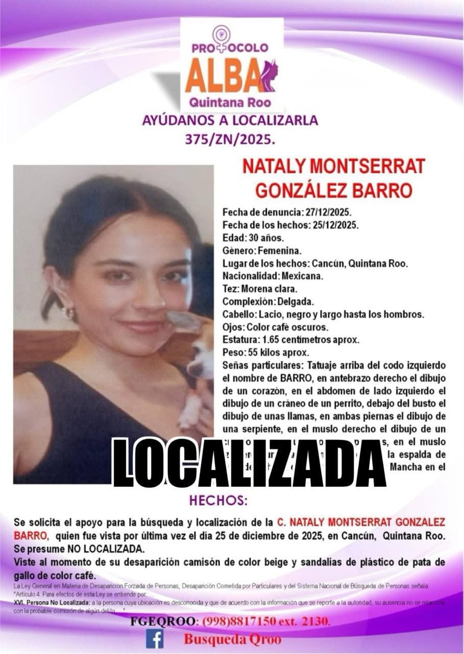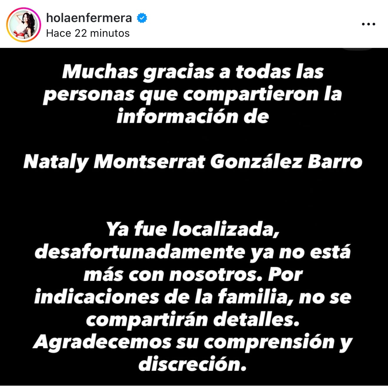 "Muchas gracias a todas las personas que compartieron la información de Nataly Montserrat González Barro. Ya fue localizada, desafortunadamente ya no está más con nosotros. Por indicaciones de la familia, no se compartirán detalles. Agradecemos su compresión y discreción”, se lee.