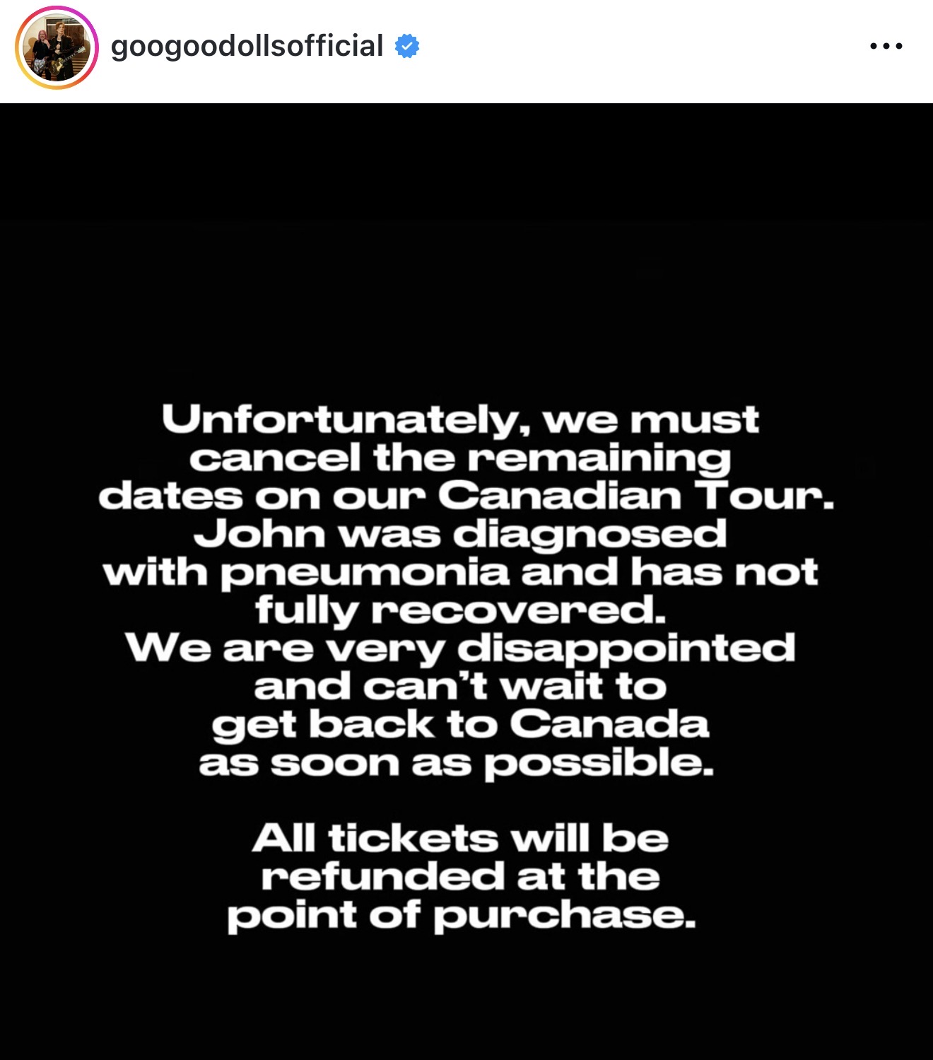 "Desafortunadamente, tenemos que cancelar el resto de las fechas de la gira en Canadá. John fue diagnosticado con neumonía y no se ha recuperado totalmente. Estamos muy tristes y esperamos regresar lo más pronto posible", se lee.