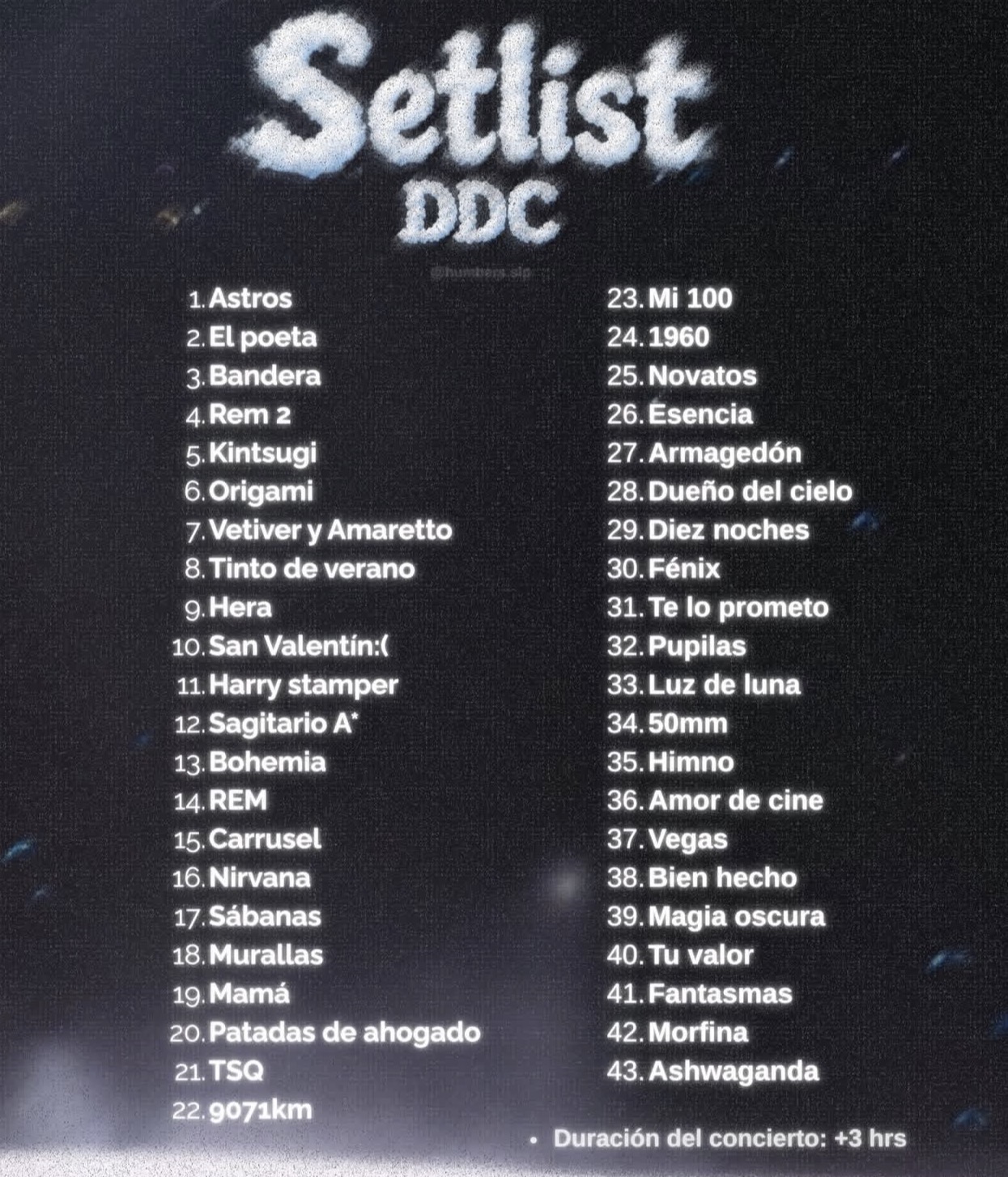 El setlist de la gira comprende más de 40 canciones de su discografía, además de momentos donde proyecta videos de una consulta con su "psicóloga".
