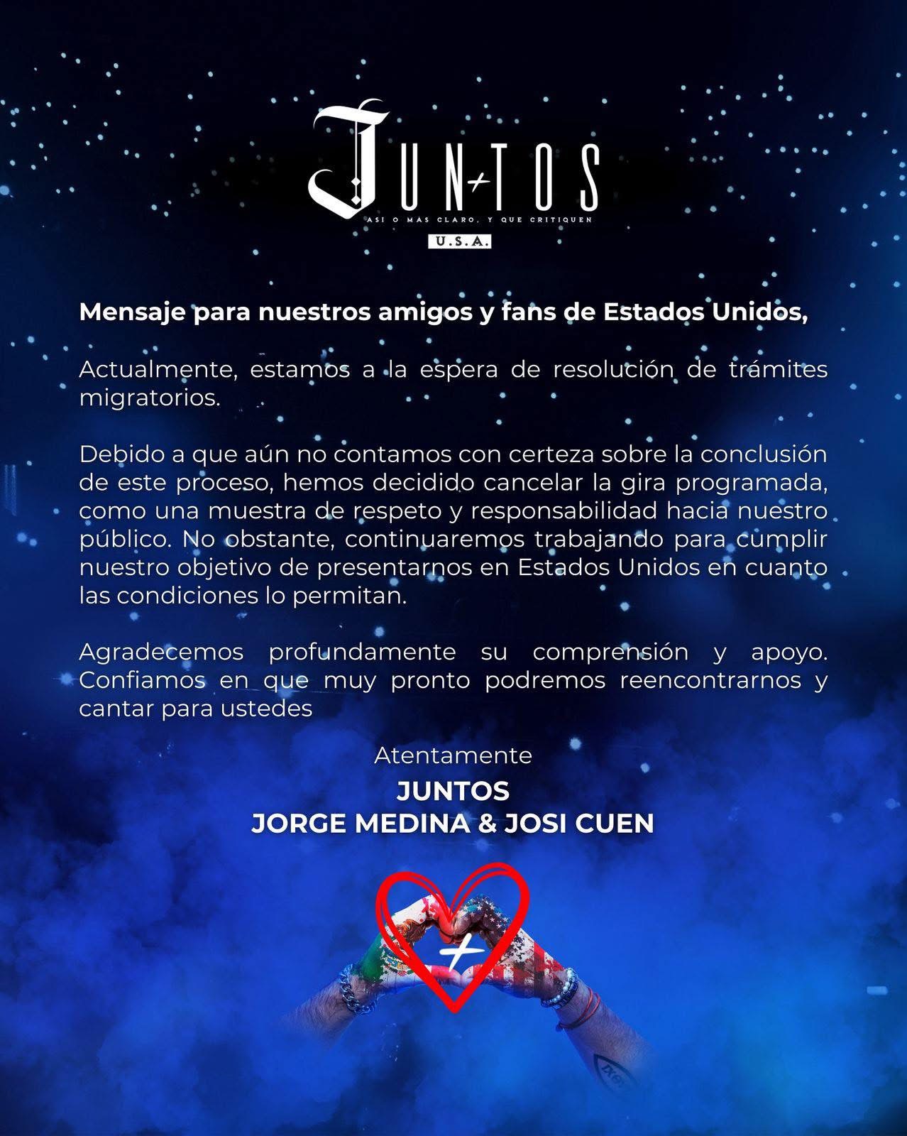 "Actualmente estamos a la espera de la resolución de trámites migratorios. Debido a que aún no contamos con certeza sobre la conclusión de este proceso, hemos decidido cancelar las fechas como una muestra de respeto y responsabilidad hacia nuestro público", explicaron los cantantes en el escrito.