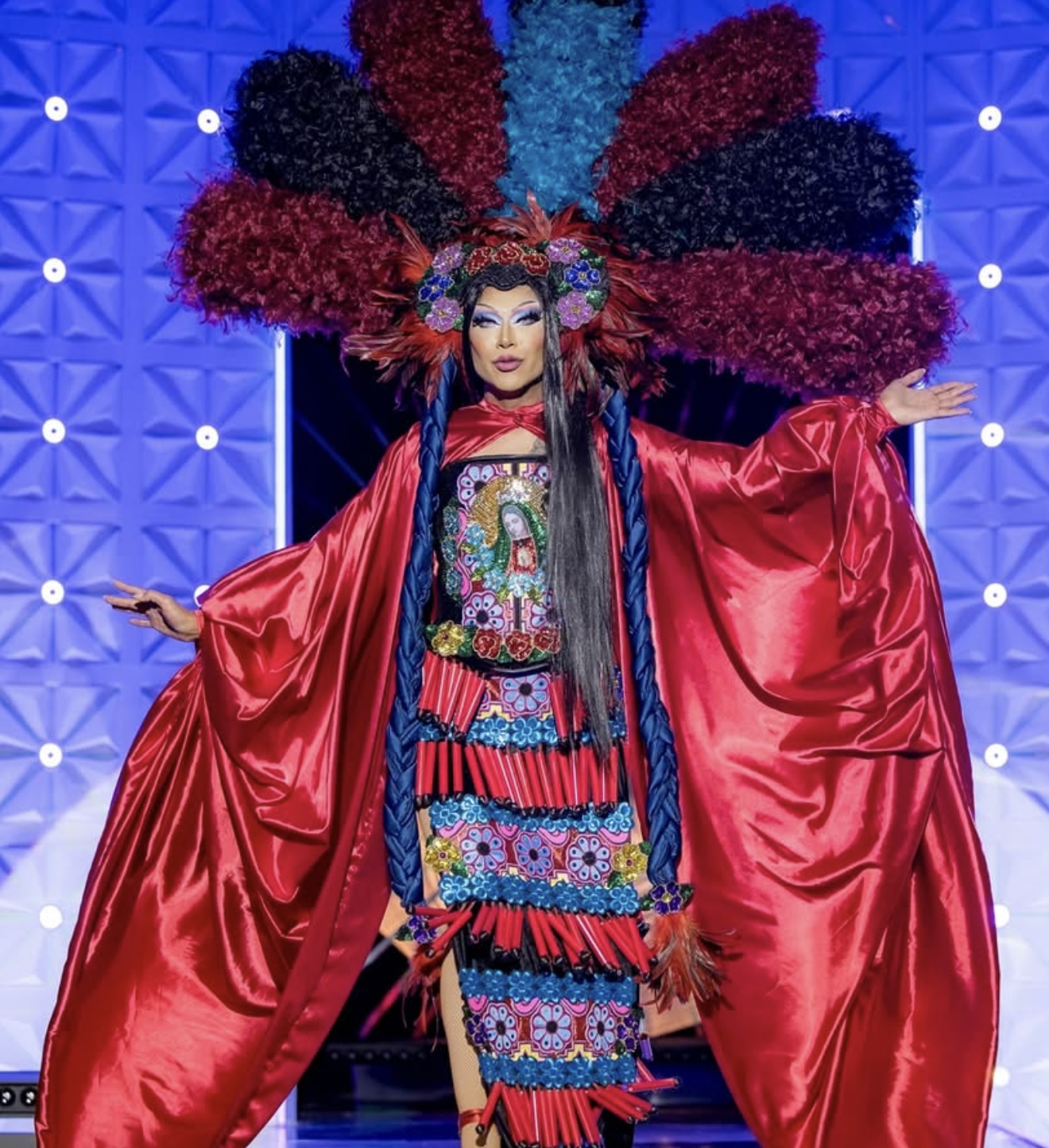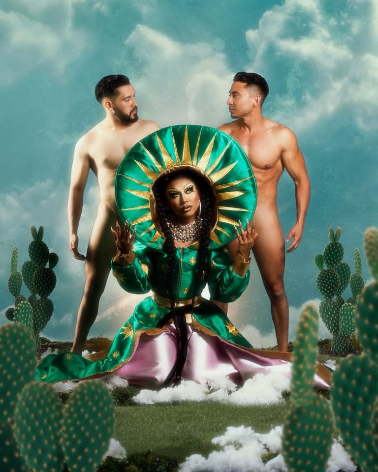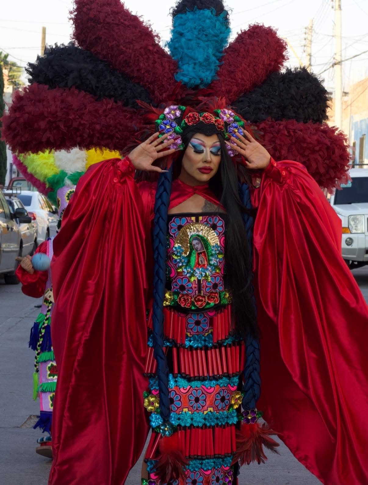 "Para esta primera pasarela les traigo La Danza de los Matlachines, tienes sus orígenes en la época colonial como un acto de sincretismo, donde la memoria indígena y la fe se entrelazan. Por eso rinden tributo a la Virgen de Guadalupe, símbolo profundo de la identidad mexicana. En esta lectura contemporánea, interpreto a La Malinche como figura mediadora: el puente cultural donde estas historias se encuentran. El drag se convierte aquí en un acto de memoria, respeto y resistencia", detalla Serena Morena.