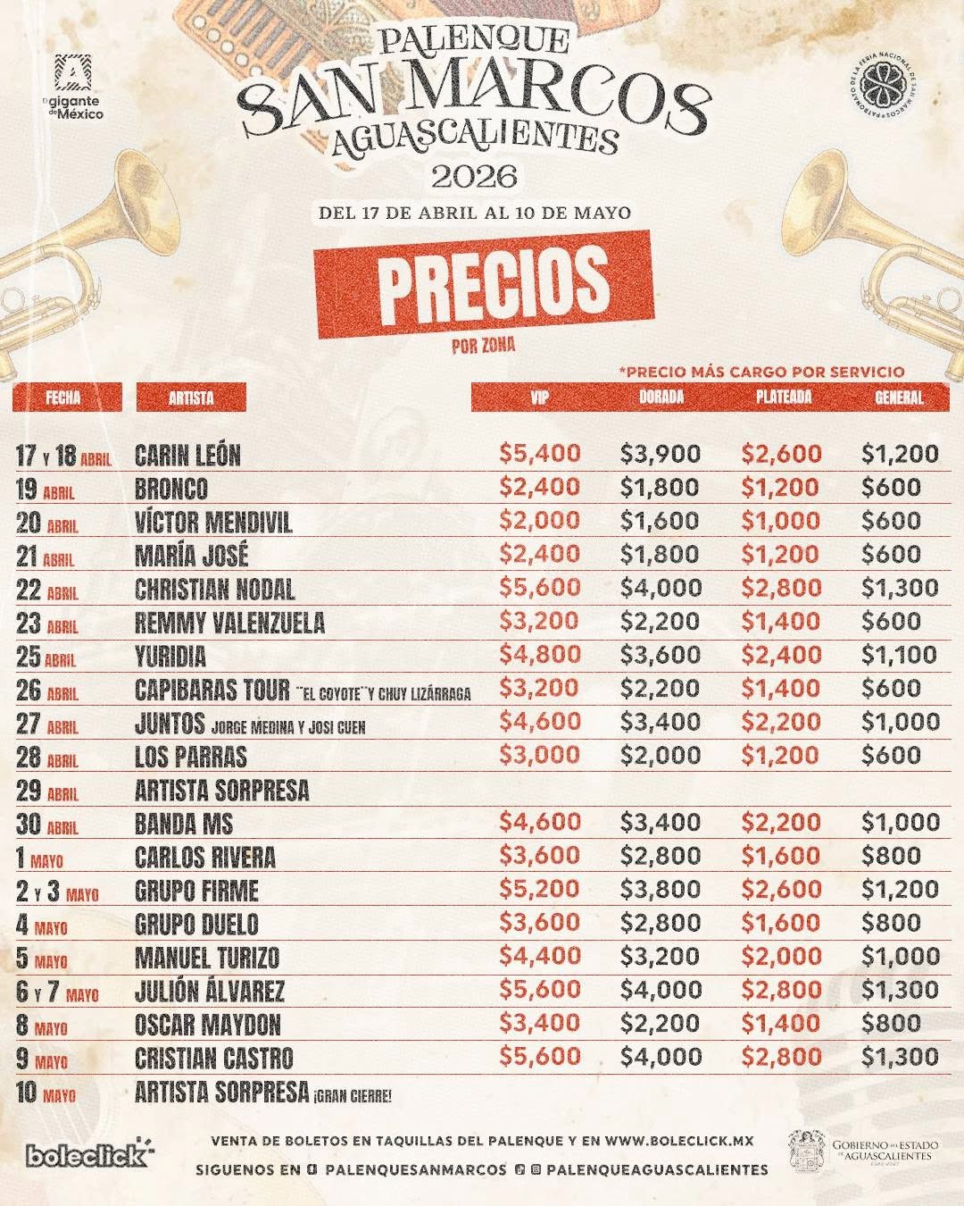 Venta de boletos a partir del viernes 20 de febrero en la página www.boleclick.mx y taquillas del Palenque en horarios de Lunes a Viernes 10am-6pm, Sábado 10am-3pm.