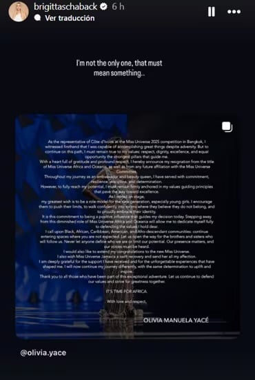 La exrepresentante de Estonia expresó su total apoyo a la delegada de Costa de Marfil, quien minutos antes también se había desvinculado del título y de la organización. Briggita compartió la imagen del comunicado de la participante y escribió: "No soy la única. Esto debe significar algo".