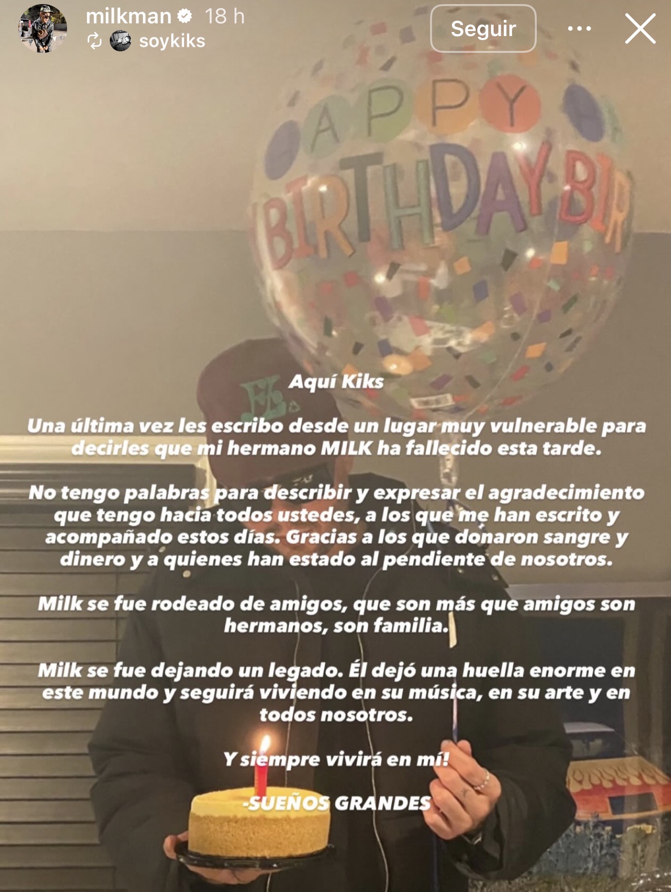 “Una última vez les escribo desde un lugar muy vulnerable para decirles que mi hermano Milk ha fallecido esta tarde”, se lee en el comunicado publicado por el Dj Soy Kiks.