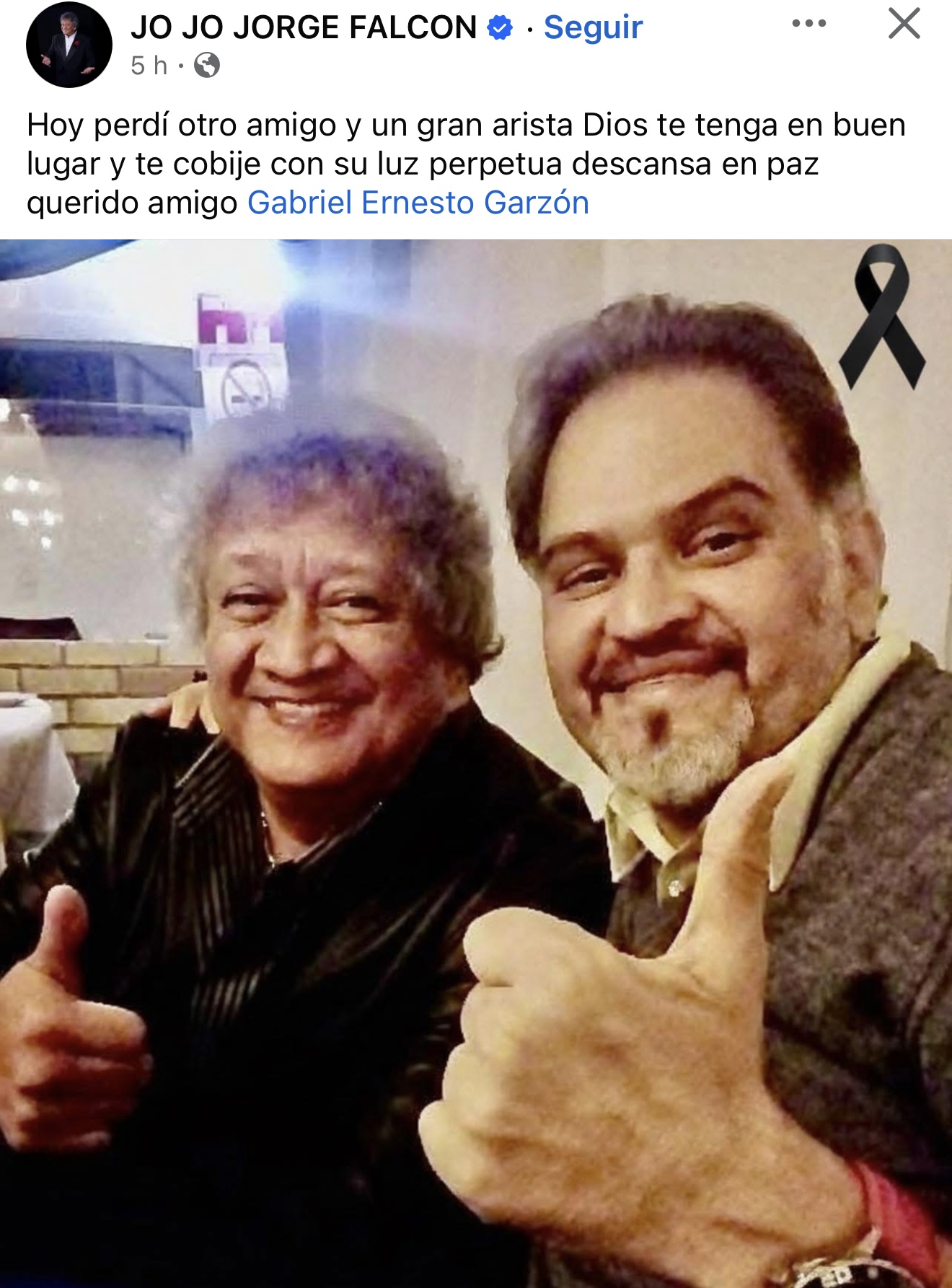 Fue el comediante Jorge Falcón, quien a través de sus redes sociales informó sobre el lamentable deceso: "Hoy perdí otro amigo y un gran artista. Dios te tenga en buen lugar y te cobije con su luz perpetua descansa en paz querido amigo Gabriel Ernesto Garzón", escribió en su cuenta de Instagram, en una publicación que acompañó con una fotografía en la que aparece al lado del actor.