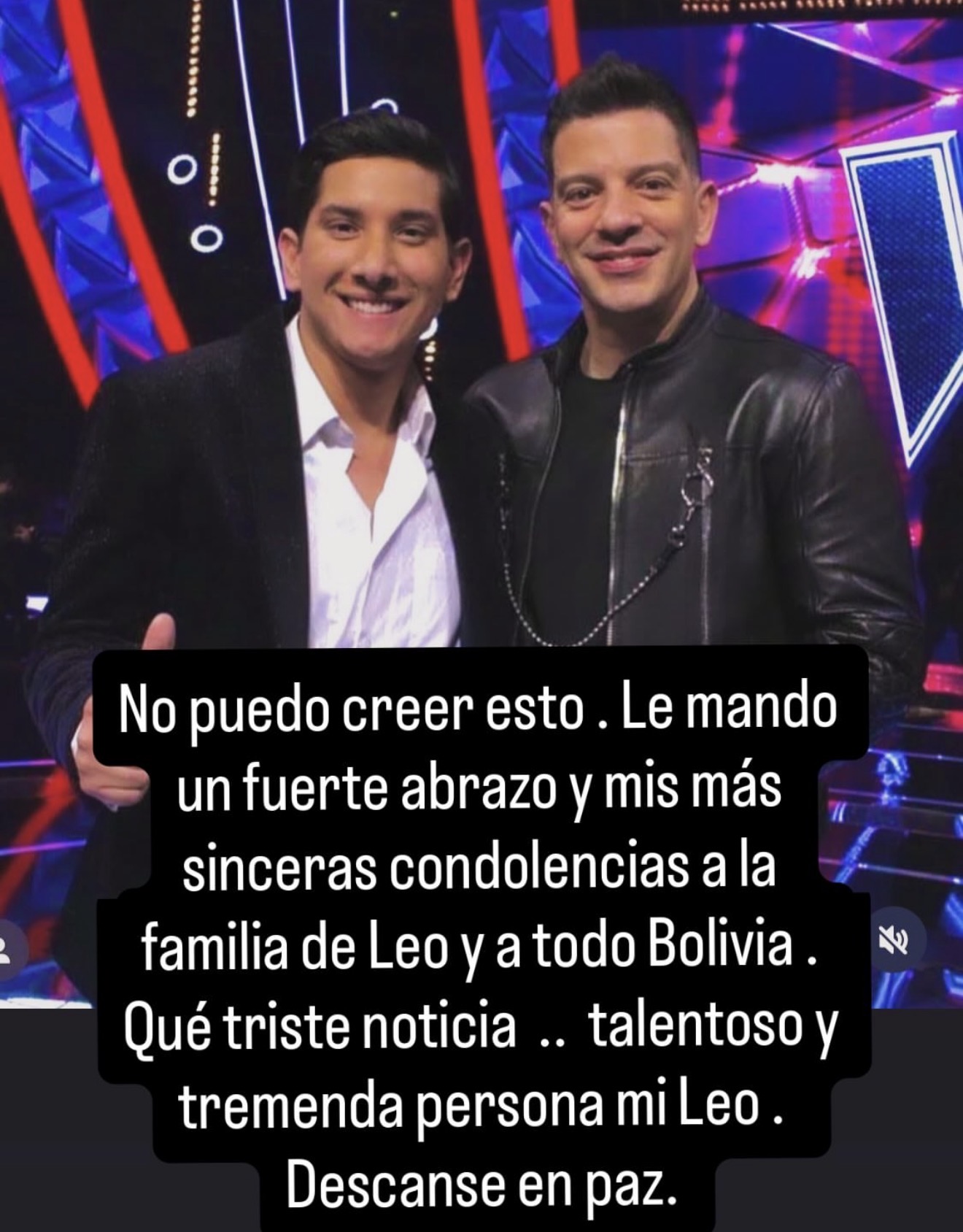 “No puedo creer esto. Le mando un fuerte abrazo y mis más sinceras condolencias a la familia de Leo y a todo Bolivia. Qué triste noticia. Talentoso y tremenda persona, mi Leo. Descanse en paz”, escribió Yahir.