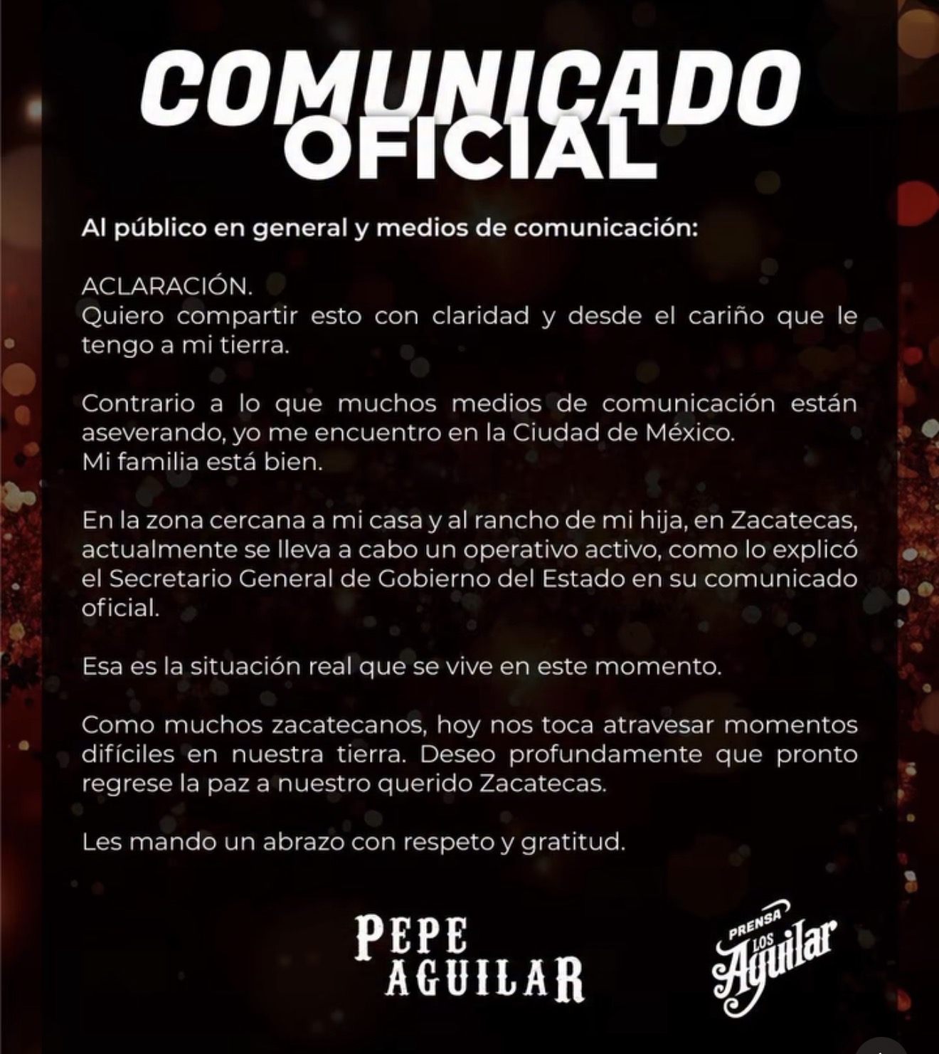 Pepe Aguilar publicó la noche de este jueves un comunicado en el que desmintió que haya sufrido un ataque armado en Zacatecas, luego de que esta tarde se difundiera dicha información.