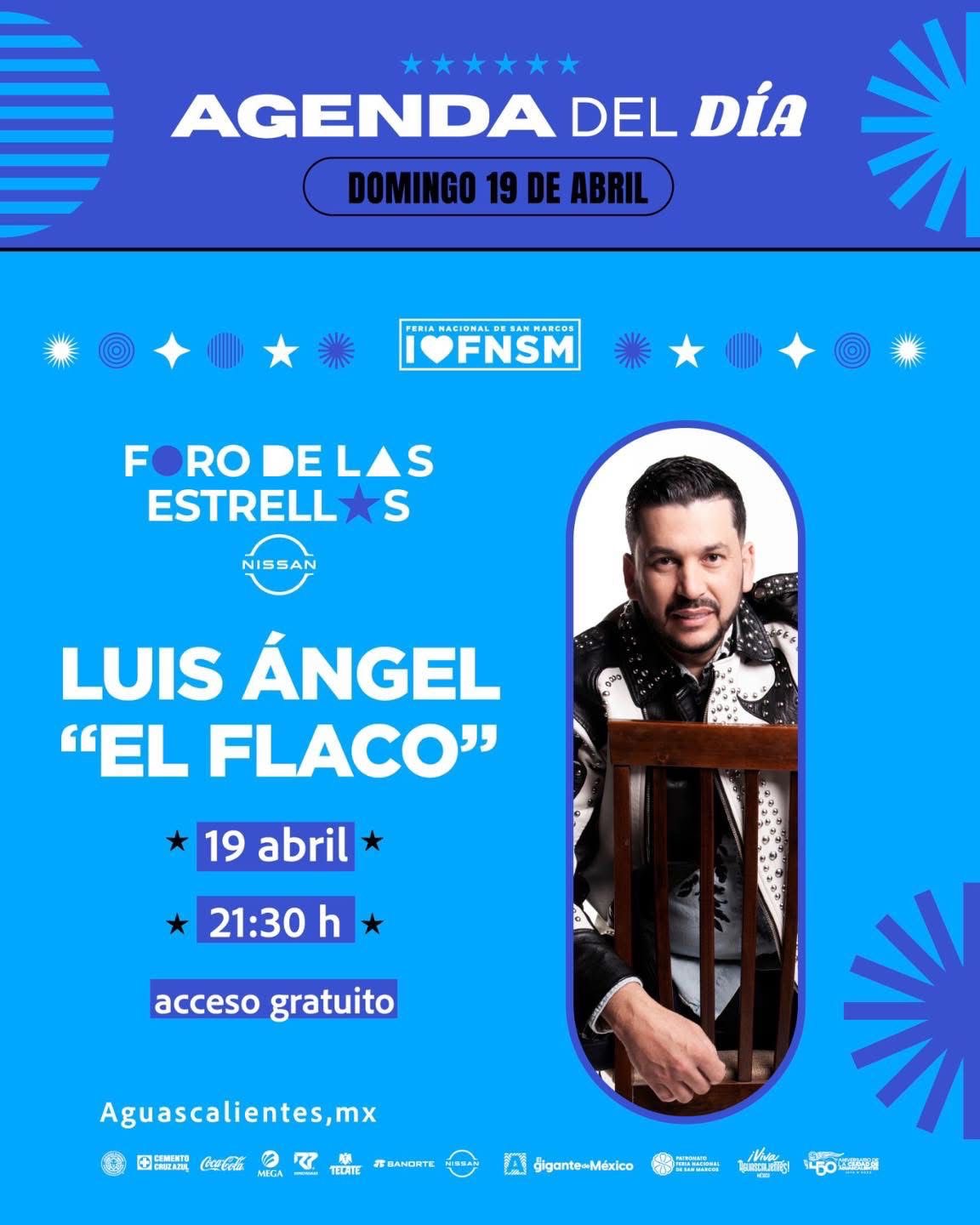 El Foro de las Estrellas recibe en su segundo día al intérprete de banda Luis Ángel "El Flaco", quien promete un repertorio lleno de éxitos de su carrera como solista así como lo que sumó siendo vocalista de Los Recoditos.