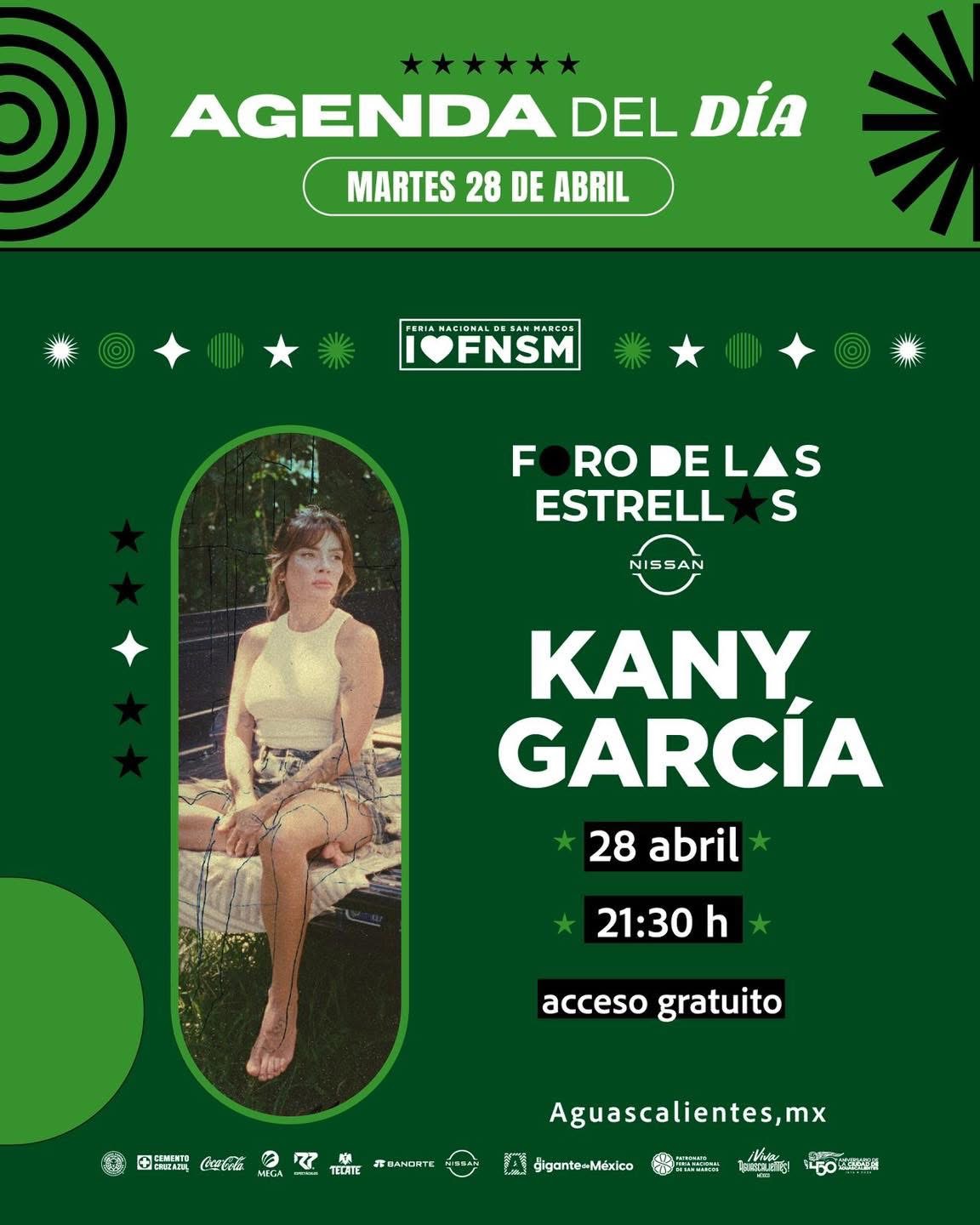 En el Foro de las Estrellas, recinto de acceso libre al público, se presentará la cantautora puertorriqueña Kany García. Su concierto está programado a las 21:30 horas.