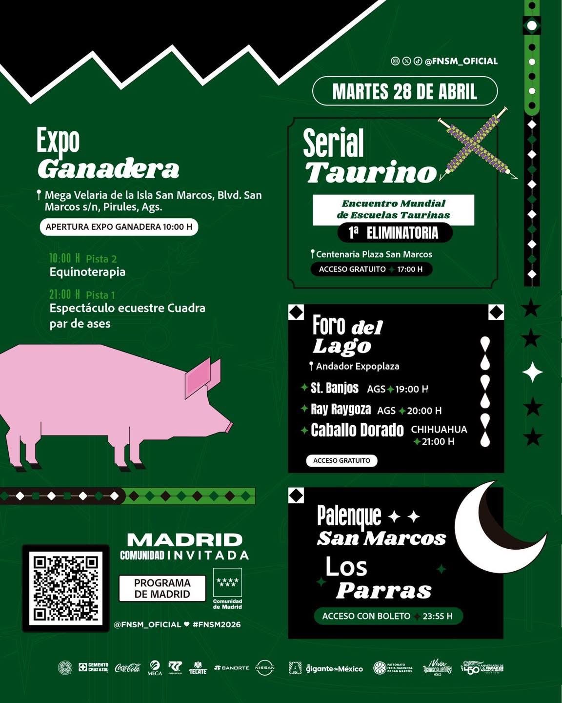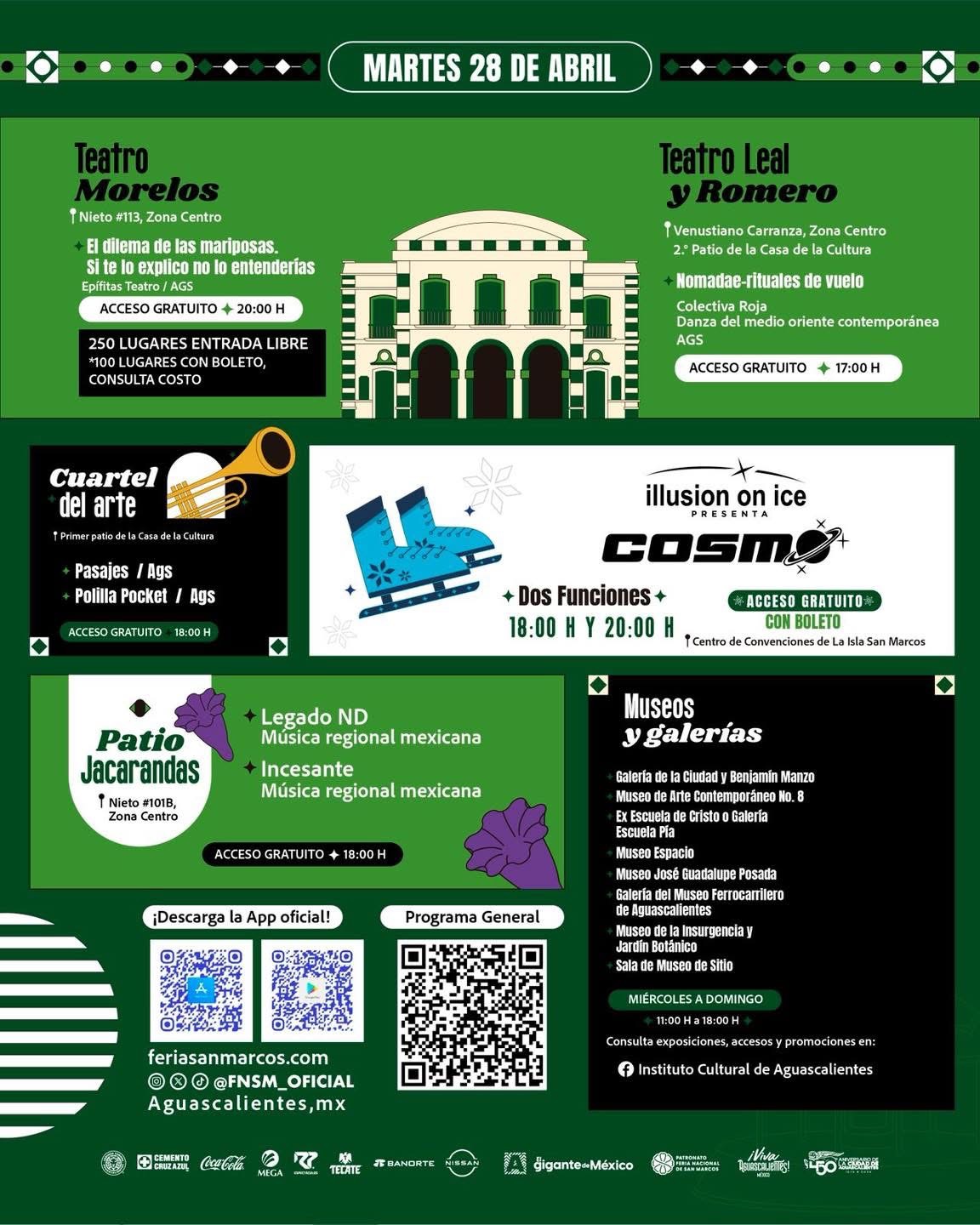 Para este martes 28 de abril, la Feria Nacional de San Marcos 2026, en Aguascalientes, ofrece un amplio programa en sus diferentes espacios.