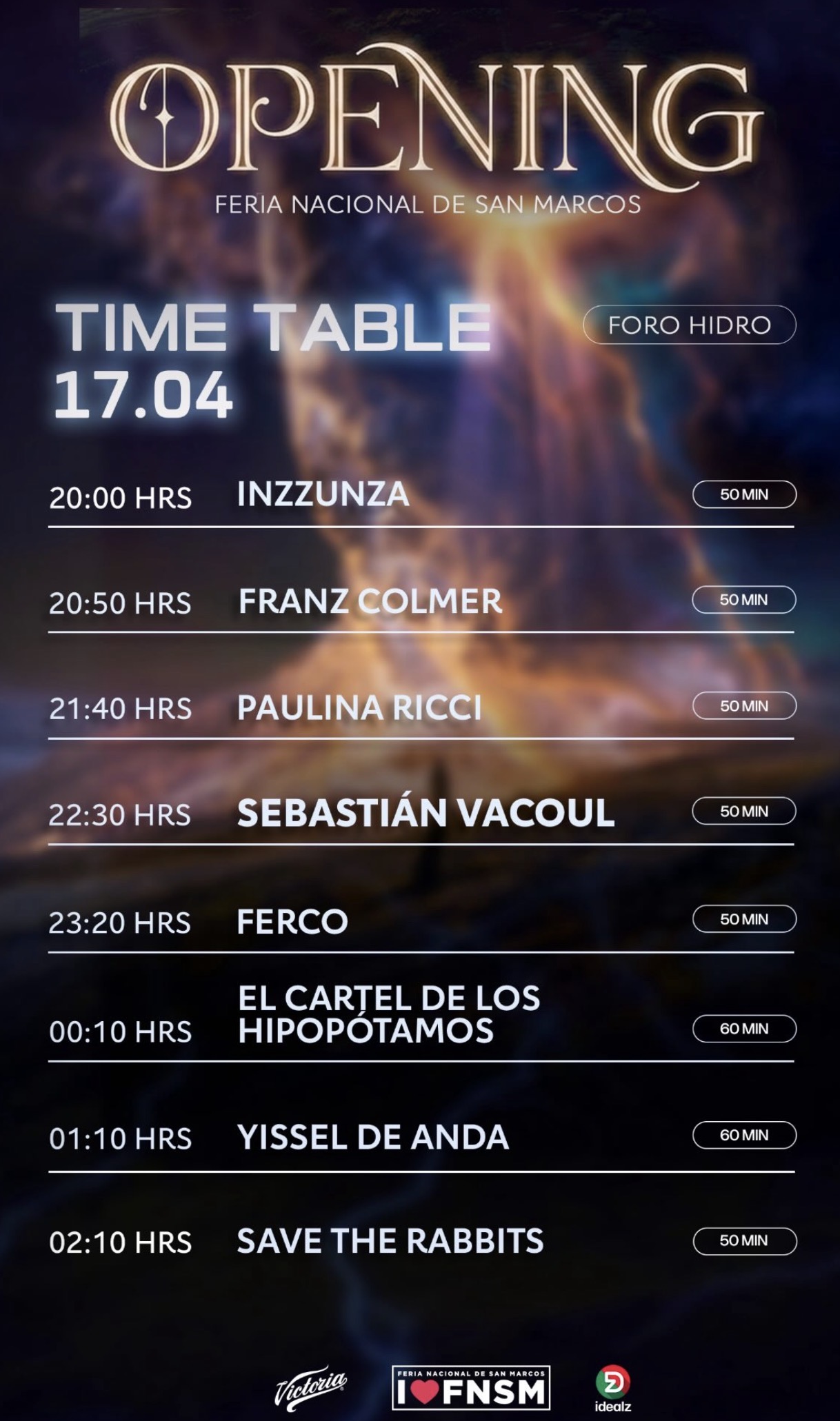 Inzzunza, Franz Colmer, Paulina Ricci, Sebastián Vacoul y Ferco serán los encargados de iniciar la fiesta para, después de las 12 de la medianoche, dar paso a El Cartel de los Hipopótamos, Yissel de Anda y Save the Rabbits.