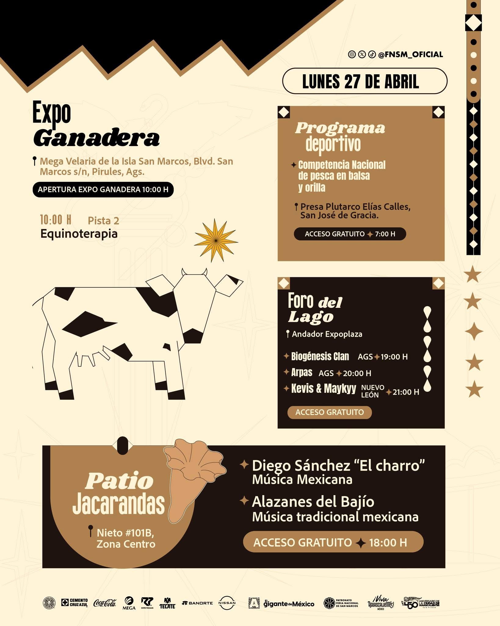 Este lunes 27 abril la Feria del Nacional de San Marcos en Aguascalientes presenta diversas actividades en sus diferentes espacios.