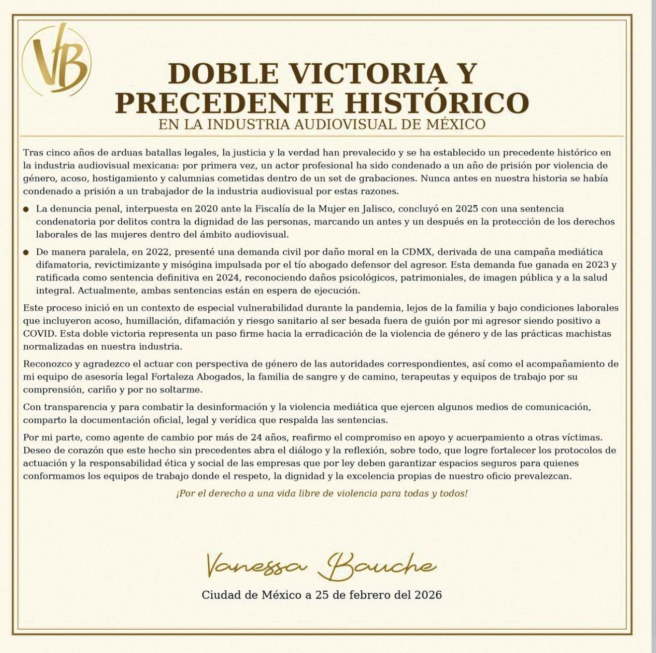 “Por primera vez, un actor profesional ha sido condenado a un año de prisión por violencia de género, acoso, hostigamiento y calumnias cometidas dentro de un set de grabaciones”, se lee en el comunicado de la artista.