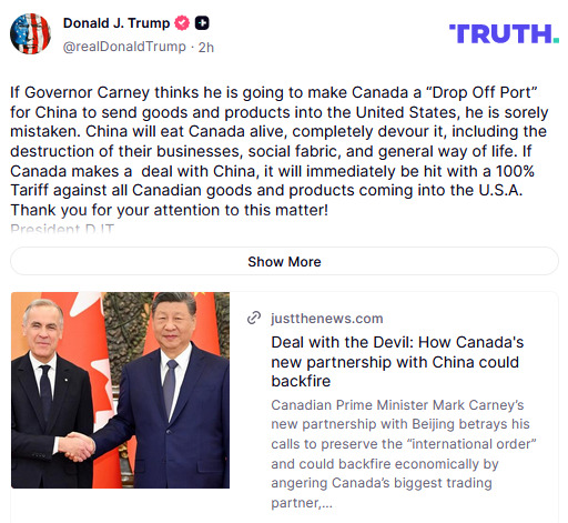 En una publicación de Truth Social, el republicano dijo que el primer ministro canadiense, Mark Carney, está "muy equivocado" si "cree que va a convertir a Canadá en un 'puerto de descarga' para que China envíe bienes y productos a Estados Unidos".