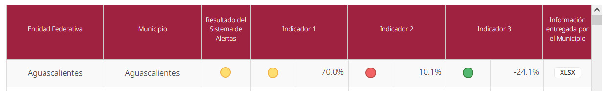 En el indicador uno del Sistema de Alertas, relativo a la deuda pública y vinculado a la sostenibilidad de la misma, Aguascalientes aparece en color amarillo (que sería nivel medio, es decir, lo califica como "endeudamiento en observación"). El indicador dos, que tiene que ver con la capacidad de pago, aparece en color rojo (que sería nivel alto y que supone un "endeudamiento elevado").