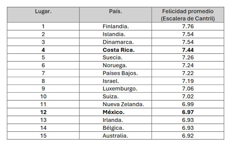 Si bien México bajó dos posiciones, es uno de los dos países latinoamericanos que están entre los primeros 15 con mayores índices de felicidad. Costa Rica es el otro, situándose en el cuarto lugar.
